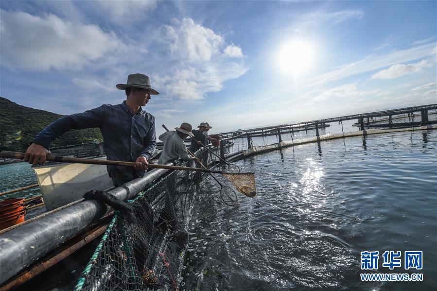 8月18日,南麂島海域的“海上牧場”養(yǎng)殖區(qū)內(nèi),漁民正捕撈大黃魚,處于仿生養(yǎng)殖環(huán)境的大黃魚需要生長2至3年。進(jìn)入8月,浙江省溫州市平陽縣南麂鎮(zhèn)海域上大片的大黃魚、貽貝等特色海產(chǎn)品養(yǎng)殖區(qū)域迎來豐收季節(jié),養(yǎng)殖戶們駕駛漁船在養(yǎng)殖區(qū)海域進(jìn)行打撈收獲,在碧海藍(lán)天下構(gòu)成了一幅“海上牧場”的美麗豐收景象。近年來,南麂鎮(zhèn)政府引導(dǎo)漁民養(yǎng)殖戶充分發(fā)揮“靠海吃海”的資源優(yōu)勢,大力發(fā)展海洋養(yǎng)殖經(jīng)濟(jì)和海島旅游經(jīng)濟(jì),實(shí)現(xiàn)了南麂由“生態(tài)美”向“產(chǎn)業(yè)美”,“產(chǎn)業(yè)美”向“經(jīng)濟(jì)美”的轉(zhuǎn)變。同時該鎮(zhèn)堅(jiān)持以大黃魚、貽貝等為特色產(chǎn)業(yè)支撐,精準(zhǔn)發(fā)展高效海洋養(yǎng)殖業(yè),重點(diǎn)培養(yǎng)一批新型職業(yè)漁民,依靠專業(yè)技術(shù)支持,實(shí)現(xiàn)深海仿生養(yǎng)殖,讓好生態(tài)造就好品質(zhì),重點(diǎn)打造南麂養(yǎng)殖品牌,組建營銷網(wǎng)絡(luò),拓展特色海產(chǎn)品市場。新華社記者 徐昱攝