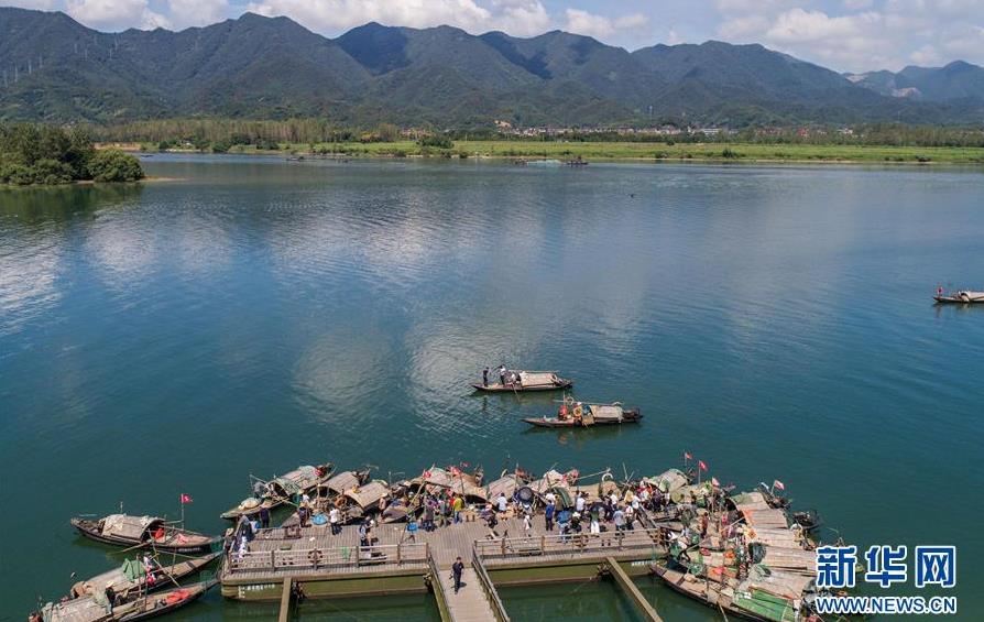 9月18日,漁船陸續(xù)從碼頭出發(fā),行駛到富春江里捕撈江鮮(無人機拍攝)。