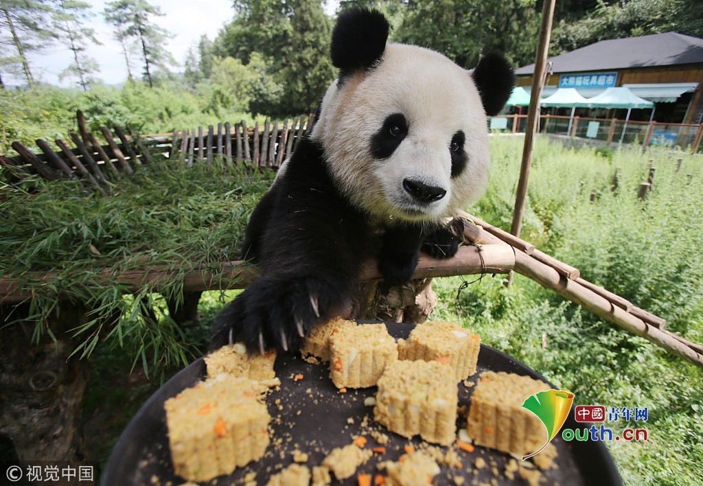 2014年9月4日,昆明,云南野生動(dòng)物園,大熊貓思嘉吃專(zhuān)屬胡蘿卜月餅。