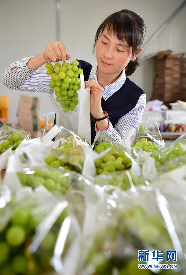 9月21日,楊凌錦田果蔬專業(yè)合作社的工作人員將剛采摘下來的葡萄裝袋。