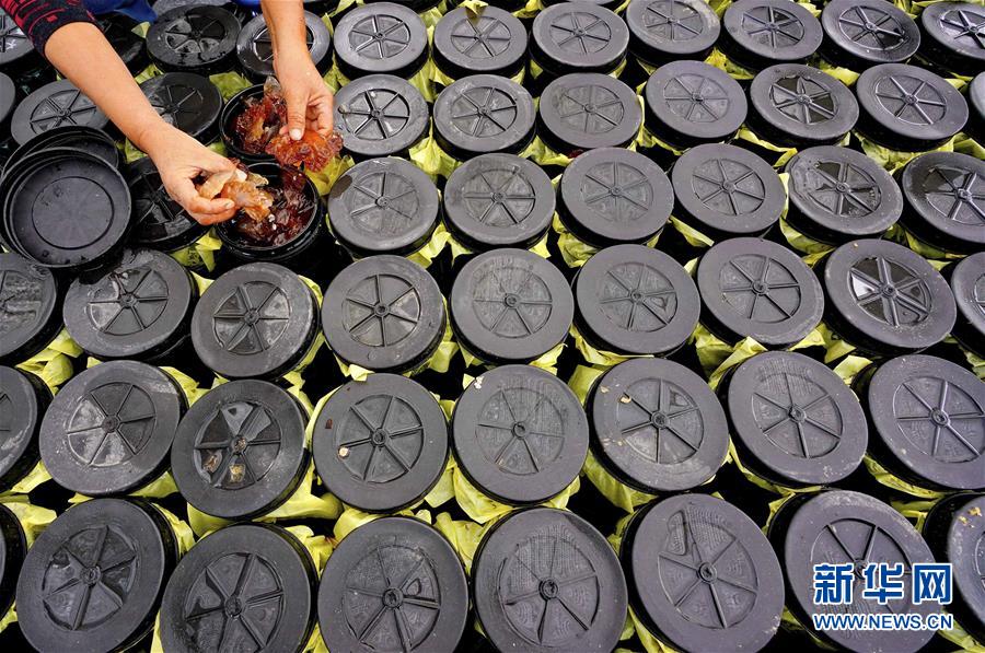 9月21日,灤南縣南堡鎮(zhèn)南堡二村一家海蜇養(yǎng)殖場的工人在海蜇鹵制池內(nèi)擺放海蜇(無人機拍攝)。新華社記者楊世堯攝
