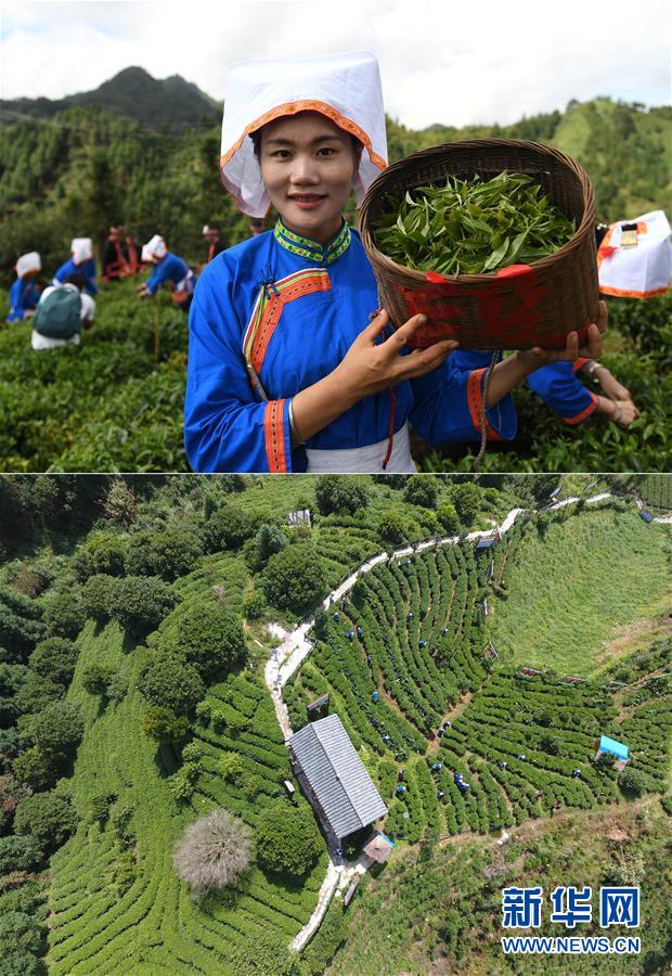 這張拼版照片顯示的是:上圖,9月20日,廣西金秀瑤族自治縣金秀鎮(zhèn)六段村村民蘇思林展示剛采摘的秋茶;下圖,9月20日,茶農(nóng)在金秀鎮(zhèn)六段村茶園內(nèi)采茶(無人機拍攝)。 新華社記者陸波岸攝