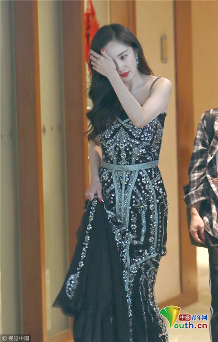 楊冪卷發(fā)成熟美露香肩 自提裙擺過(guò)酒店大堂