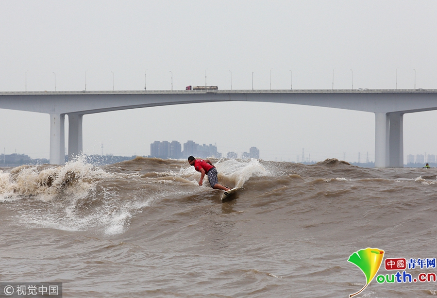 中國青年網(wǎng)北京9月27日電 2018年9月26日下午,杭州錢江江面上,一個個沖浪弄潮兒英姿颯爽。在錢塘江里戲浪前行的,正是參與錢塘江槳板精英賽的高手們。圖片作者/視覺中國
