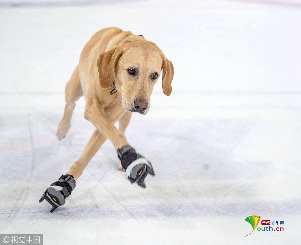 2018年9月26日訊。(具體拍攝時(shí)間不詳)這只可愛的拉布拉多犬本尼是世界上第一只會(huì)滑冰的狗。