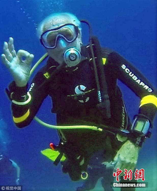 當?shù)貢r間2018年9月1日,塞浦路斯,95歲的英國潛水員雷·伍利(Ray Woolley)以44分鐘下潛40.5米的成績打破了自己94歲達成的記錄(41分鐘下潛38.1米),二度刷新了世界上年齡最大的男性潛水員最好成績。在此次下潛中,這位二戰(zhàn)退伍老兵對距塞浦路斯南部城鎮(zhèn)拉納卡約2公里處的海域進行了探索,1980年一艘名為“芝諾比亞號”(Zenobia)的貨船在這里進行首次航行時沉沒。圖片來源:視覺中國