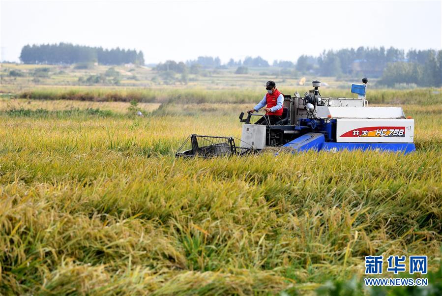 9月27日,在鳳陽(yáng)縣小崗村,農(nóng)民駕駛收割機(jī)收割水稻。新華社記者 劉軍喜 攝
