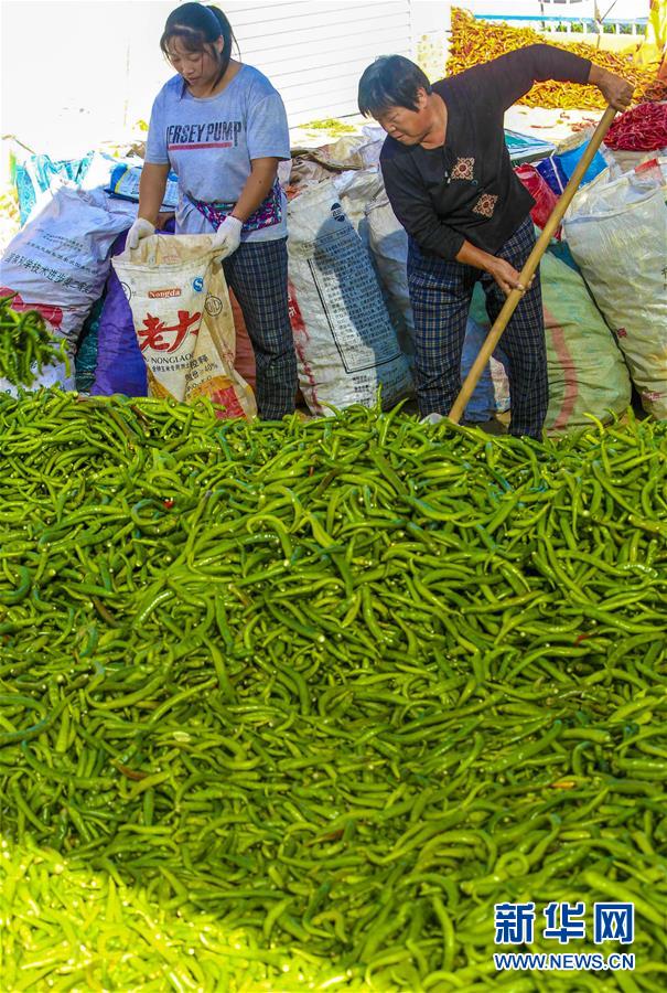 9月28日,饒陽(yáng)縣留楚鄉(xiāng)影林村的種植戶在將辣椒裝袋。 近年來(lái),河北省饒陽(yáng)縣結(jié)合市場(chǎng)需求,積極引進(jìn)特色品種辣椒種植,開(kāi)辟出一條農(nóng)民增收致富新路。目前,該縣特色辣椒種植面積1000余畝,種植戶年均增收3000余元。 新華社記者 李曉果攝