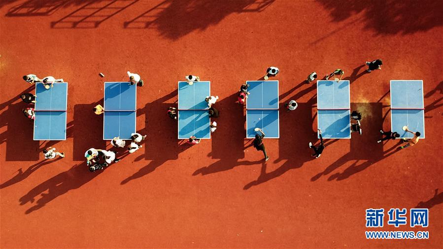 學(xué)生在安徽鳳陽小崗村小崗學(xué)校內(nèi)打乒乓球(9月26日無人機(jī)拍攝)。 新華社記者 張端攝