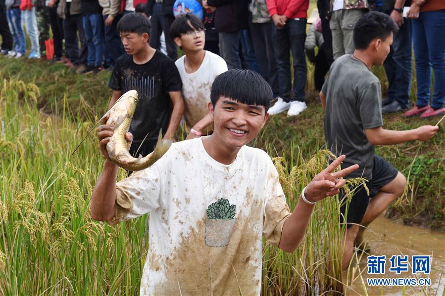 9月29日,一名小伙子展示摸到的魚。9月29日,云南省尋甸回族彝族自治縣2018年首屆農(nóng)民豐收節(jié)暨第二屆摸魚節(jié)在雞街鎮(zhèn)舉行,當?shù)剞r(nóng)民和游客在豐收的稻田里進行摸魚、拔谷穗、山歌對唱等活動,享受收獲的喜悅。新華社記者楊宗友攝