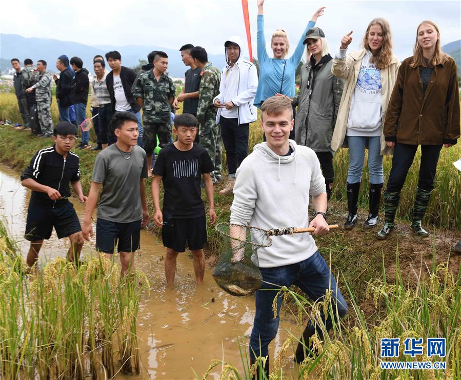 9月29日,外國游客體驗摸魚。9月29日,云南省尋甸回族彝族自治縣2018年首屆農民豐收節(jié)暨第二屆摸魚節(jié)在雞街鎮(zhèn)舉行,當地農民和游客在豐收的稻田里進行摸魚、拔谷穗、山歌對唱等活動,享受收獲的喜悅。新華社記者楊宗友攝