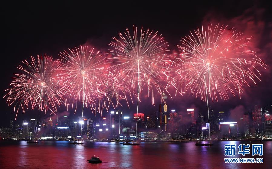 這是10月1日晚拍攝的香港維多利亞港煙花匯演。當(dāng)晚,香港維多利亞港舉行煙花匯演,慶祝中華人民共和國(guó)成立69周年。新華社記者李鋼攝