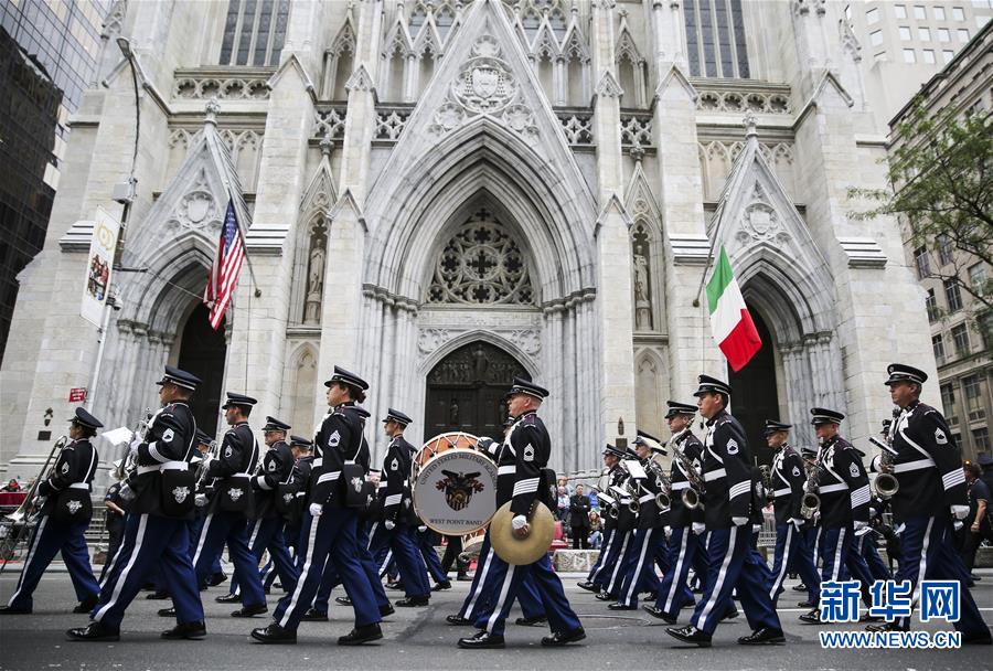 10月8日,在美國(guó)紐約曼哈頓第五大道,美國(guó)西點(diǎn)軍校樂(lè)隊(duì)參加哥倫布日游行。 新華社記者王迎攝