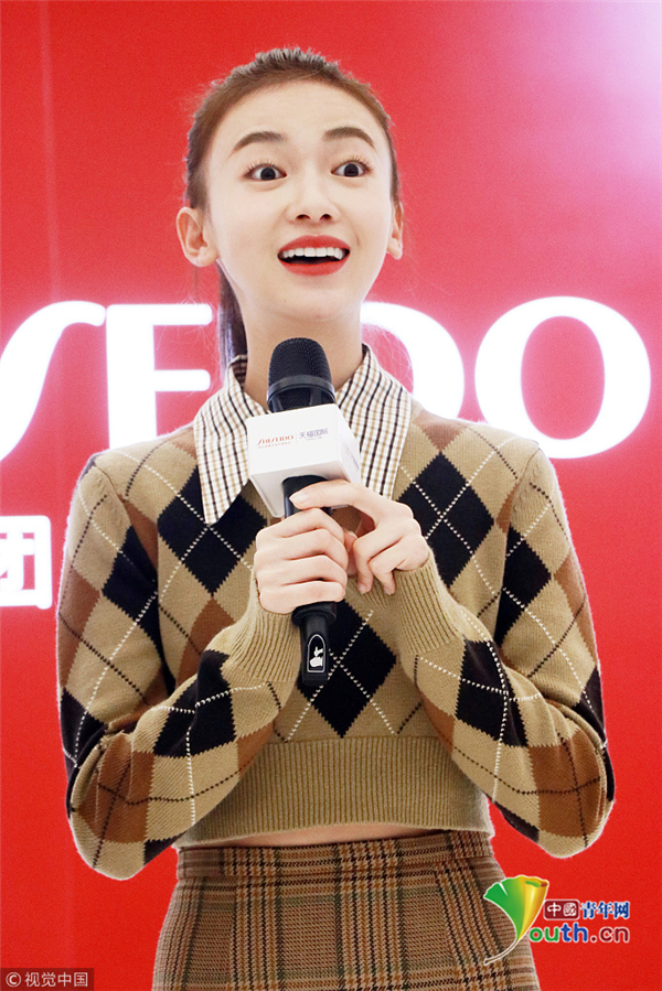 吳謹言穿學(xué)院風套裝梳馬尾 甜笑比心少女范十足