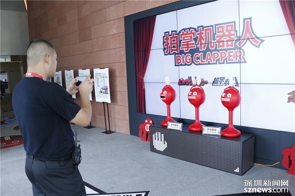 一名參觀者在拍掌機器人項目前拍照