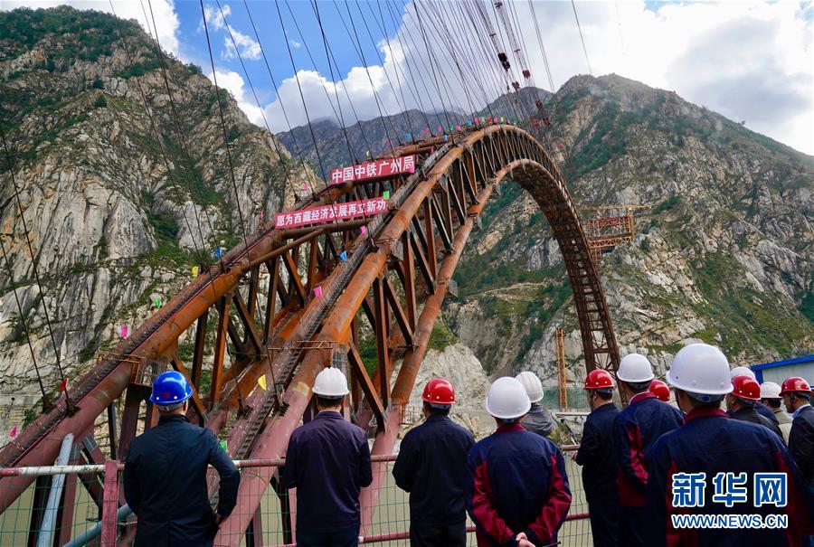 9月28日拍攝的川藏鐵路拉林段重點(diǎn)標(biāo)志性工程藏木特大橋合龍儀式現(xiàn)場。 當(dāng)日,隨著最后一節(jié)鋼管拱的對位和鎖定完畢,川藏鐵路拉林段藏木特大橋成功合龍,標(biāo)志著大橋主體結(jié)構(gòu)施工取得了關(guān)鍵性勝利。藏木特大橋由中國中鐵廣州局集團(tuán)承建,拱高112米,橋橫跨雅魯藏布江峽谷,水深66米。 新華社記者普布扎西攝