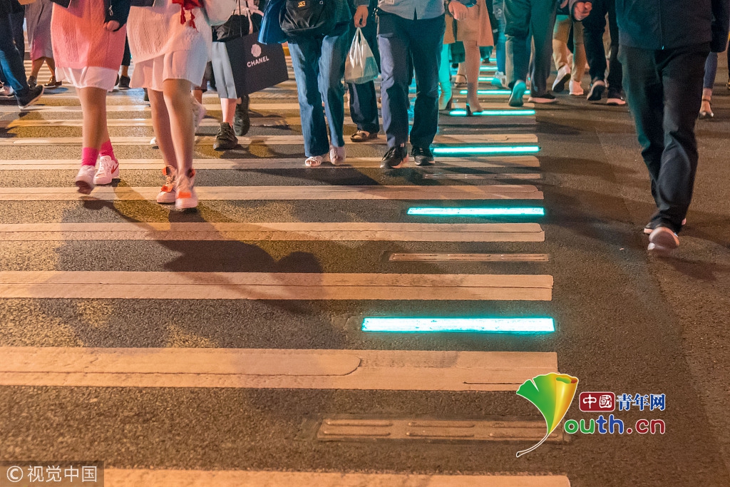 當(dāng)天傍晚在陳毅廣場(chǎng)附近看到,南京東路與中山東一路交匯處的兩側(cè)人行道上,發(fā)光地磚的顏色與行人信號(hào)燈顏色同步變化:綠燈時(shí),發(fā)光地磚顯示為閃爍的綠色;紅燈時(shí),發(fā)光地磚則切換為紅色。