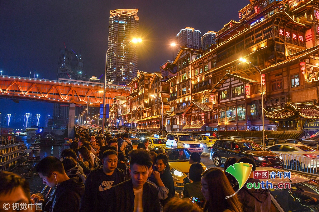 2018年10月8日,重慶,國慶長假結(jié)束后,山城網(wǎng)紅景點洪崖洞依然處于暴擠狀態(tài),在抖音等短視頻平臺走紅以后,絢爛輝煌的洪崖洞夜景成為赴渝旅行第一打卡景點。