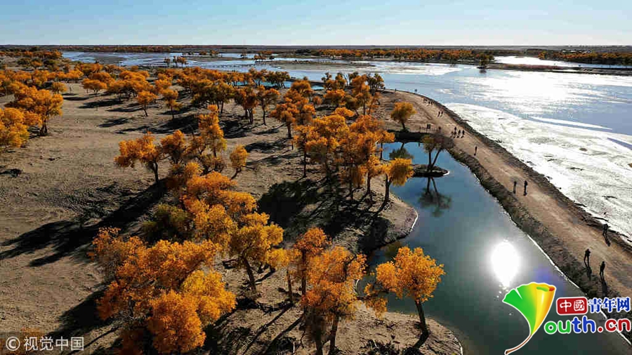 航拍內(nèi)蒙古額濟納自治旗的胡楊林。