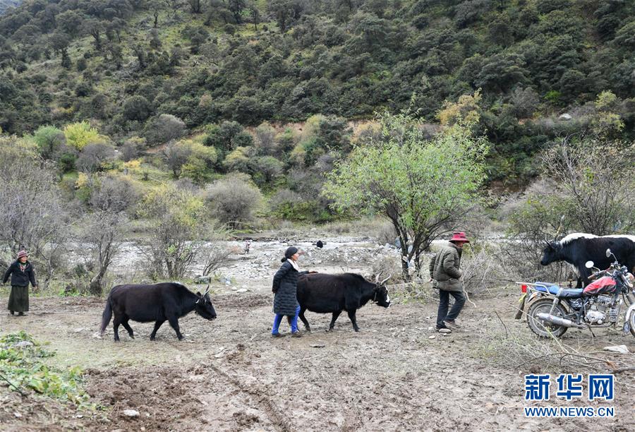 波羅鄉(xiāng)一臨時過渡安置點內(nèi)的群眾在放牛(10月14日攝)。 新華社記者 劉東君 攝