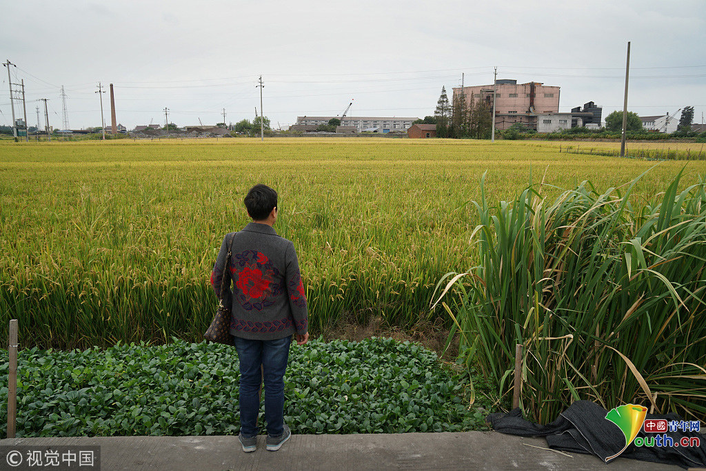 2018年10月14日,浙江嘉興嘉善縣陶莊,張娟芬(何永妹)家的草房子早沒有了,原址現(xiàn)在是一個小工廠,周圍是農(nóng)田。垂下的稻穗飽滿發(fā)黃,等待收割。圖片作者:田建明