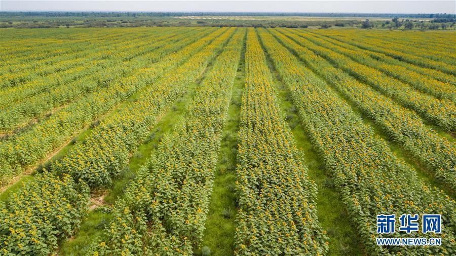 內(nèi)蒙古達(dá)拉特旗白土梁林場(chǎng)的沙棘葵花套種田(8月1日無(wú)人機(jī)拍攝)。 新華社記者張善臣攝