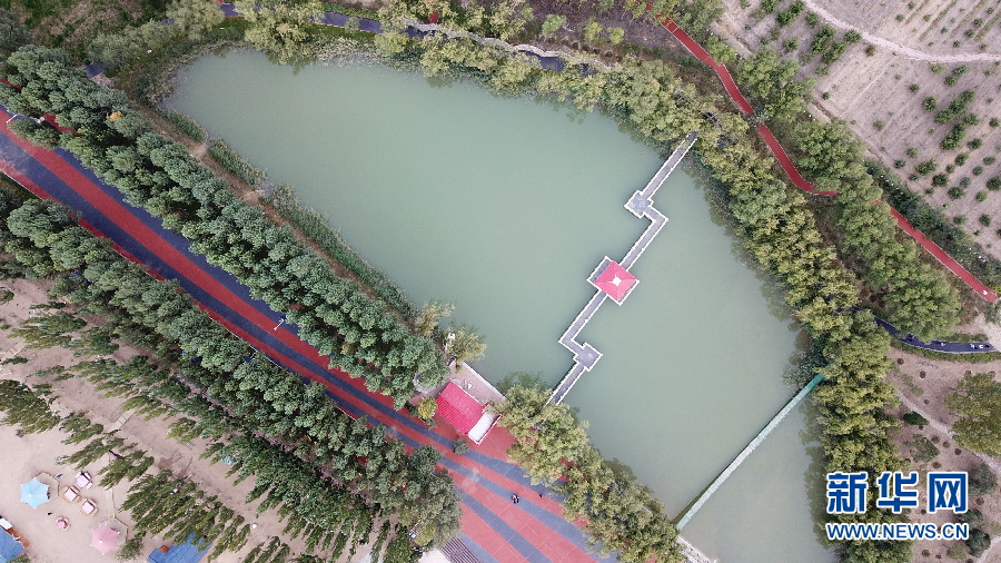 恩格貝月亮湖猶如鑲嵌在沙漠綠洲里的一塊碧玉。(新華網(wǎng) 王宇 攝)
