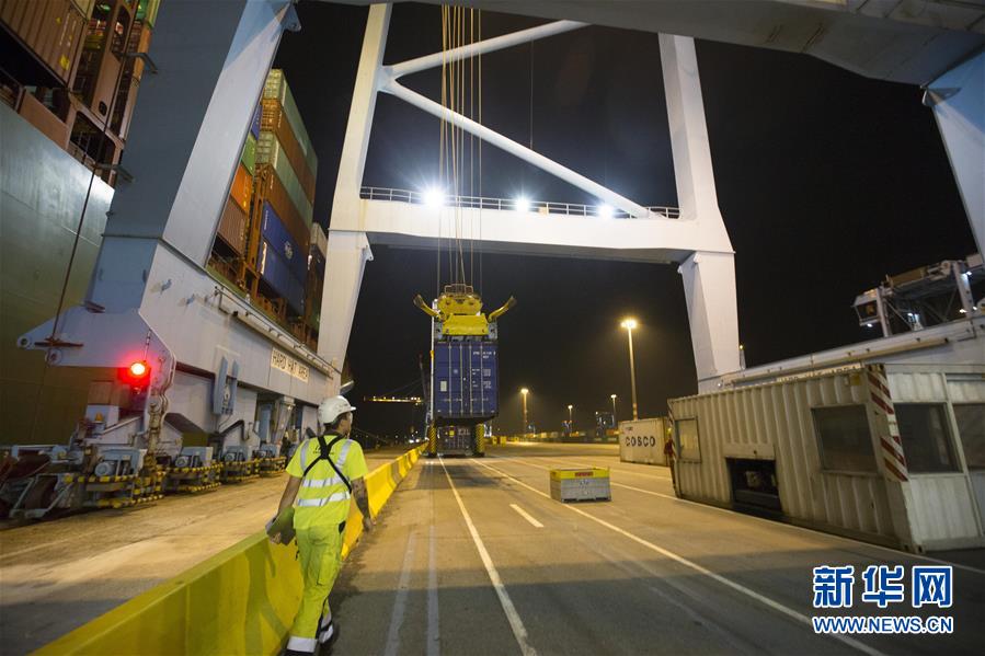 10月15日晚,在比利時澤布呂赫港集裝箱碼頭,跨運(yùn)車運(yùn)送集裝箱。 新華社記者 葉平凡 攝