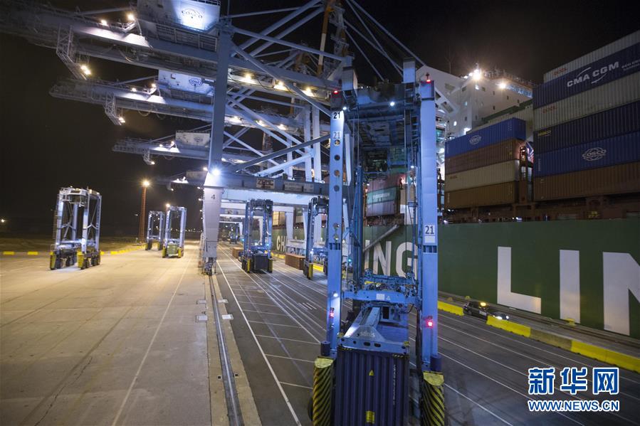 10月15日晚,在比利時(shí)澤布呂赫港集裝箱碼頭,跨運(yùn)車(chē)運(yùn)送集裝箱。 新華社記者 葉平凡 攝