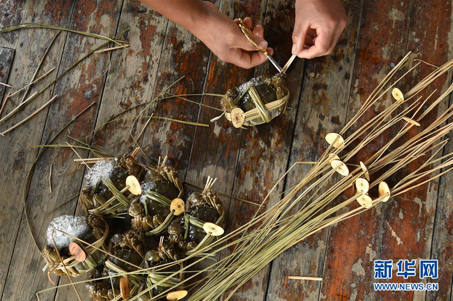 10月17日,湖州廟港人水產(chǎn)有限公司蟹農(nóng)在太湖養(yǎng)殖基地包裝大閘蟹。 時值重陽,太湖南岸的大閘蟹開始大批量上市,迎來豐收季。浙江省湖州市近年來結(jié)合太湖水治理,提升太湖漁業(yè)資源質(zhì)量。目前,湖州太湖蟹養(yǎng)殖面積3.6萬畝左右,年產(chǎn)3000多噸。 新華社記者翁忻旸攝