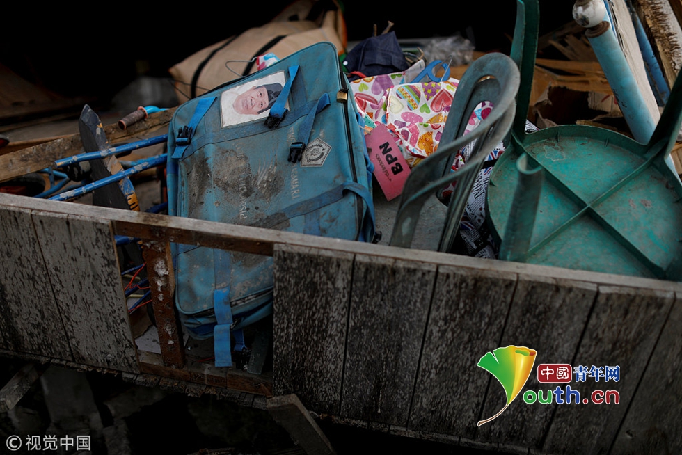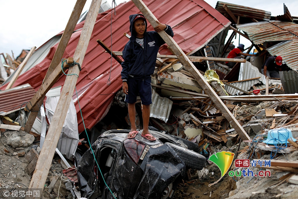 當?shù)貢r間2018年10月11日,印尼帕盧,15歲的Ikhmal Yudanto站在他母親的汽車上,汽車在地震中被嚴重毀壞。