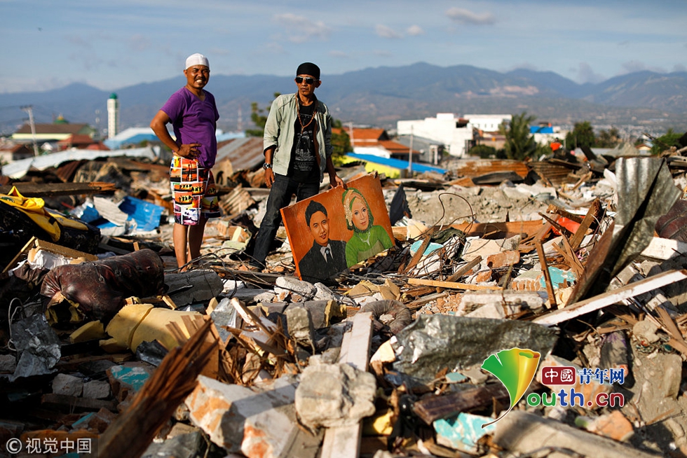 當?shù)貢r間2018年10月7日,印尼帕盧,兩名男子從地震廢墟中找回他們?nèi)ナ栏改傅漠嬒?。圖片作者:JORGE SILVA/視覺中國