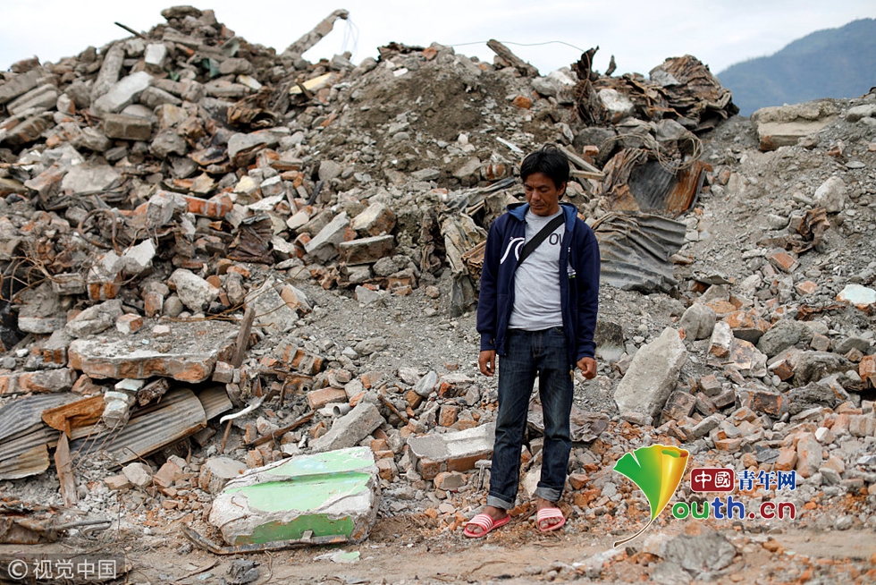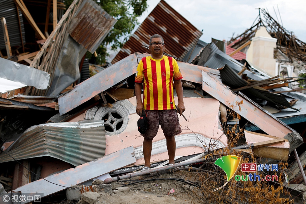 當?shù)貢r間2018年10月11日,印尼帕盧,43歲的農(nóng)民Ahmad在廢墟旁邊,這里曾經(jīng)是他的家。他希望能找到妻子和兩個女兒的遺體。他的三女兒被發(fā)現(xiàn)時受了重傷,現(xiàn)在正在醫(yī)院接受治療。