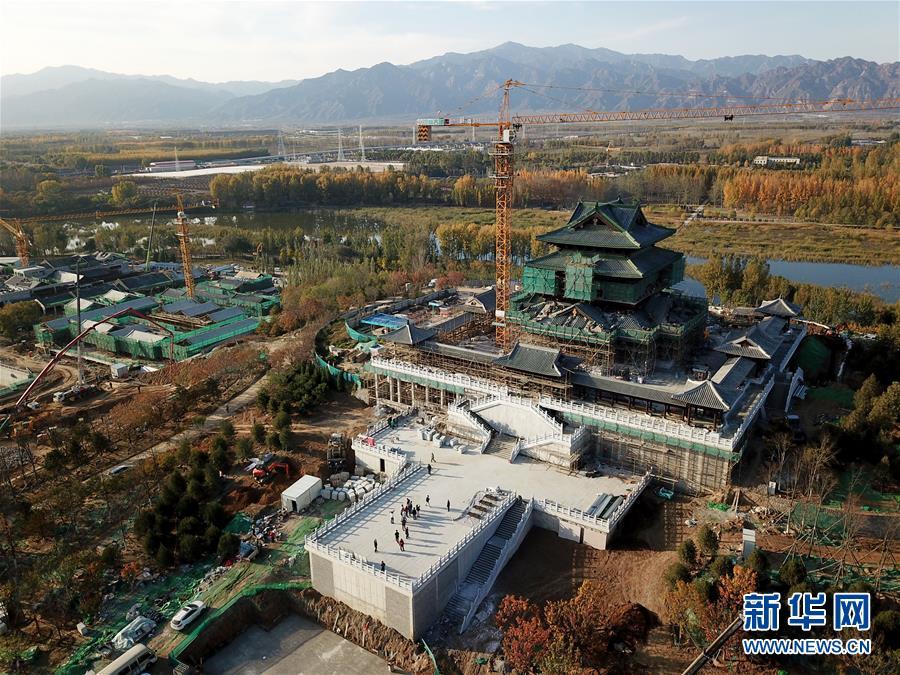 10月18日拍攝的建設(shè)中的北京世園會(huì)永寧閣(無(wú)人機(jī)拍攝)。 新華社記者 羅曉光 攝