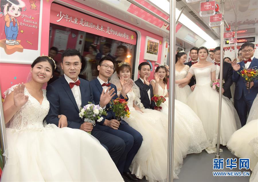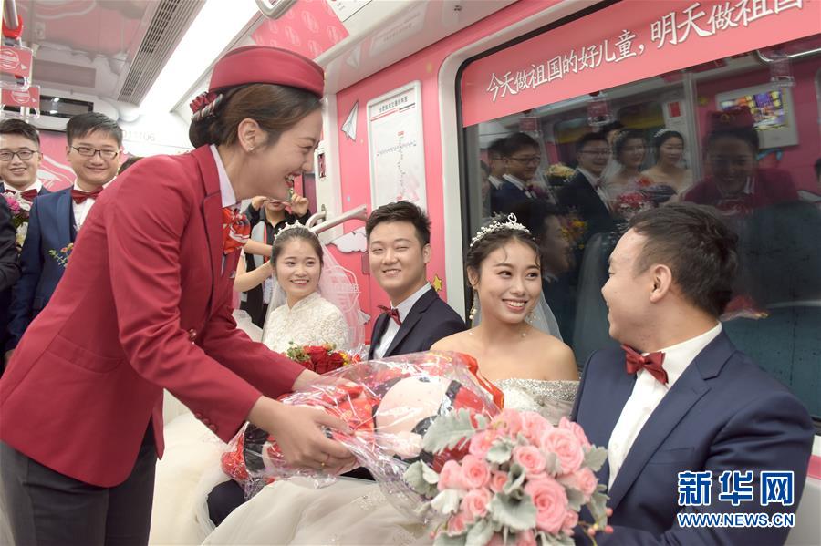 10月18日,在合肥市地鐵一號(hào)線,新人們準(zhǔn)備乘坐地鐵。當(dāng)日,中鐵四局集團(tuán)城市軌道交通工程分公司的18對(duì)新人在安徽合肥地鐵一號(hào)線的車廂里舉行了一場(chǎng)集體婚禮儀式。 新華社記者 郭晨 攝