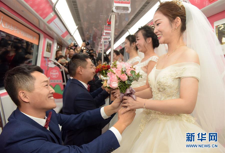 10月18日,在合肥市地鐵一號線車廂內(nèi),新郎向新娘獻花。 當日,中鐵四局集團城市軌道交通工程分公司的18對新人在安徽合肥地鐵一號線的車廂里舉行了一場集體婚禮儀式。 新華社記者 郭晨 攝