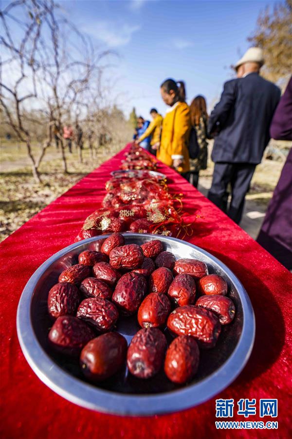 10月20日,在且末縣阿熱勒鎮(zhèn)有機紅棗園里,紅棗經(jīng)銷商在品嘗紅棗。 新華社記者 趙戈 攝