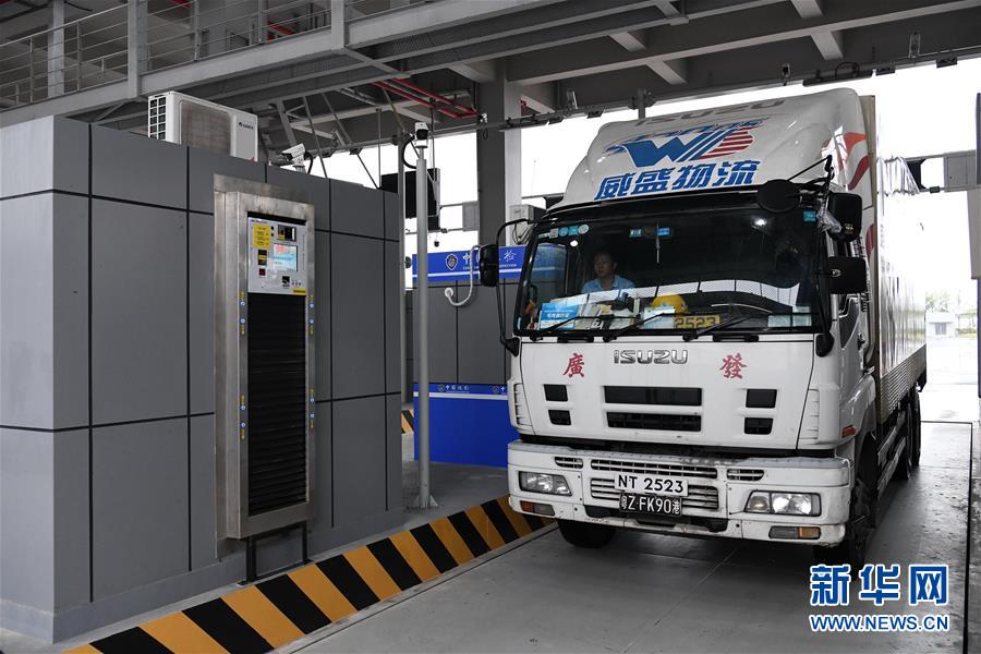 這是貨運(yùn)車輛在進(jìn)行模擬通關(guān)(10月17日攝)。 新華社記者 梁旭 攝