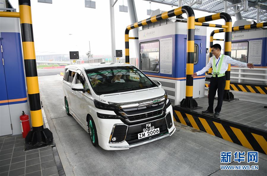 10月24日,首輛從珠海開往香港的私家車輛通過港珠澳大橋收費站。當日,港珠澳大橋正式通車。 新華社記者梁旭攝