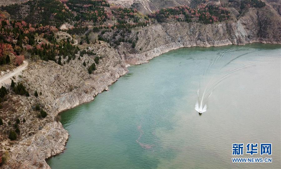 10月24日,一艘快艇從劉家峽水庫(kù)庫(kù)區(qū)駛過(guò)(無(wú)人機(jī)拍攝)。 新華社記者 陳斌 攝