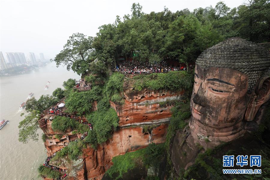 10月4日,游客在樂(lè)山大佛景區(qū)的棧道上有序排隊(duì),一睹大佛真容?!⌒氯A社記者 江宏景 攝
