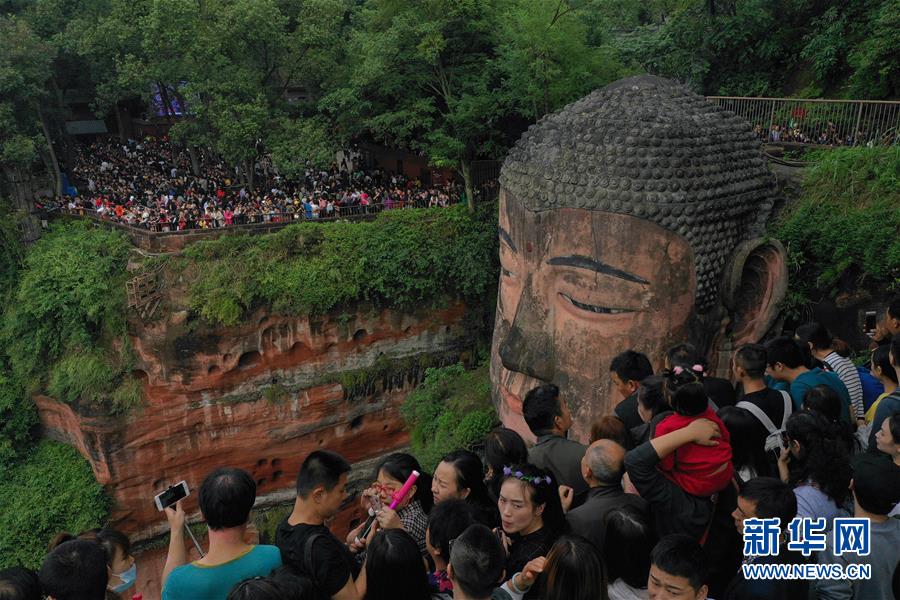 10月4日,游客在樂山大佛前排隊一睹大佛真容(無人機拍攝)。 新華社記者 江宏景 攝