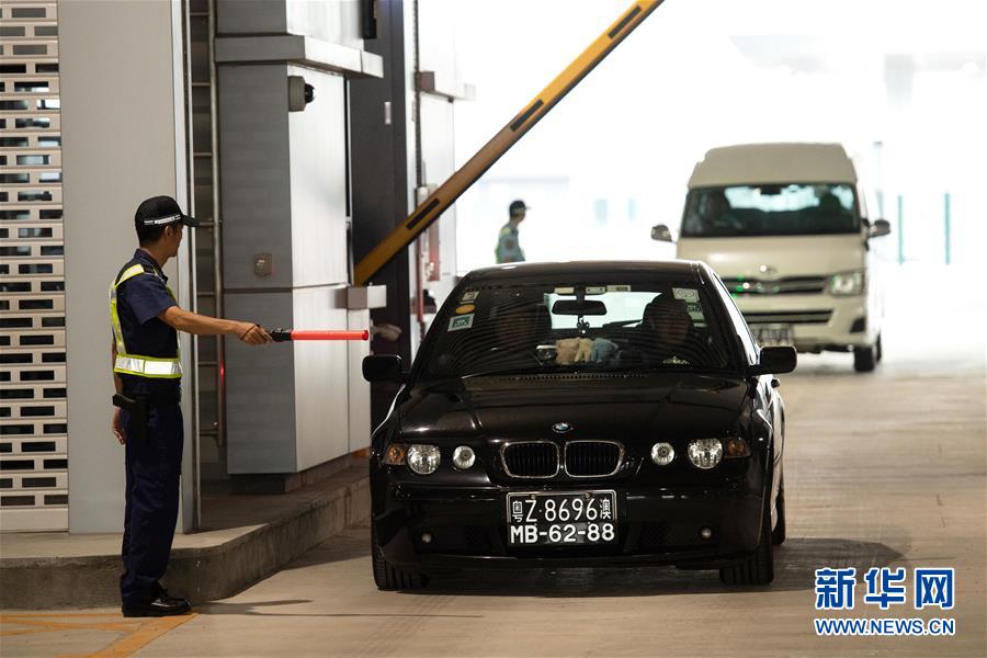 10月24日,首輛私家車(chē)在澳門(mén)口岸離境車(chē)道上通關(guān)。當(dāng)日9時(shí),港珠澳大橋正式通車(chē)。 新華社記者張金加攝