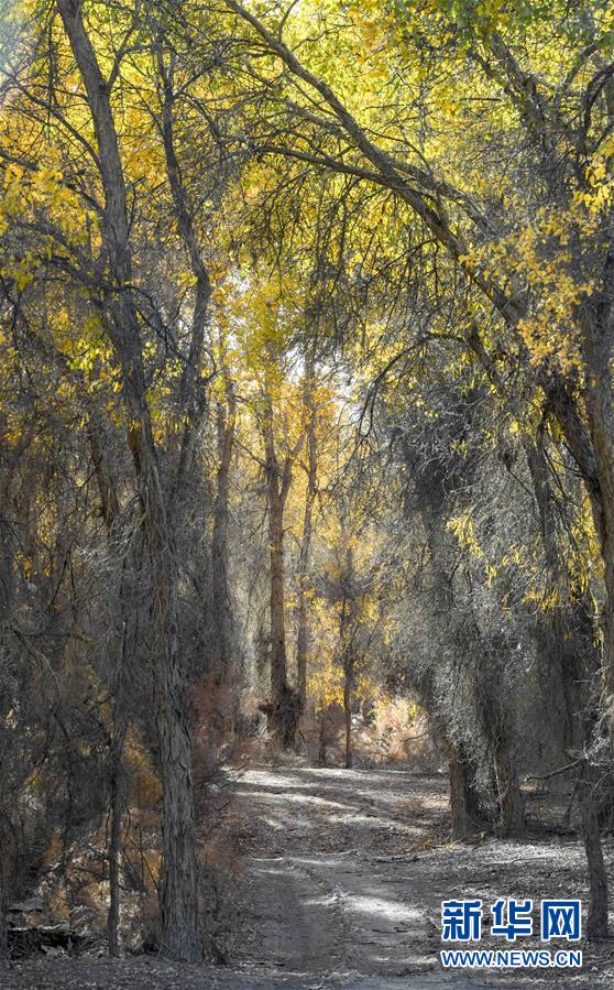 新疆尉犁縣胡楊林深處的一條小路(10月25日攝)。 10月中下旬,靜靜的塔里木河中下游一片金黃。胡楊深處,條條小路蜿蜒綿長通向遠方,引人入勝。 塔里木河是中國最長的內陸河,這一區(qū)域原始胡楊林分布較為集中。隨著塔里木河連續(xù)19次向下游生態(tài)輸水,為胡楊林“解渴”,塔河兩岸生態(tài)得到明顯改善,沙地面積逐年減少。 新華社記者趙戈攝