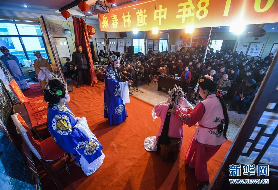 2018年2月6日,長興風華藝術團的演員們?yōu)楹闃蜴?zhèn)中道村的村民們演出越劇。據(jù)了解,長興縣每年都會安排100多場“送戲下鄉(xiāng)”活動,滿足村民的精神文化需求。新華社記者 徐昱 攝