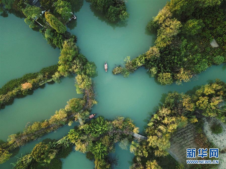 10月29日,游船行駛在西溪濕地河道上(無人機(jī)拍攝)。 新華社記者翁忻旸攝