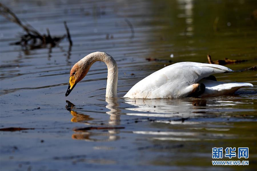 10月31日,大天鵝在山西平陸黃河濕地覓食。新華社記者 楊晨光 攝