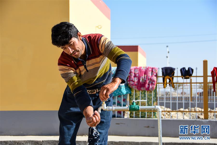 買(mǎi)合肉甫·木拉吧在庭院里洗手。相較于去河里取水,新城里的自來(lái)水大大方便了生活(10月28日攝)。新華社記者 關(guān)俏俏 攝