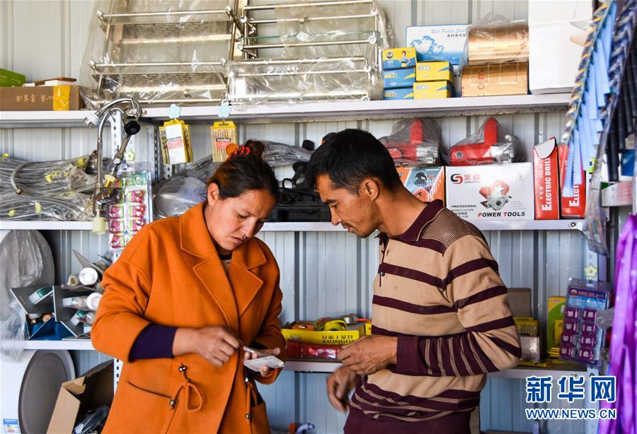 在位于澤普縣桐安鄉(xiāng)的建材鋪里,熱娜古麗·喀爾曼(左)跟前來(lái)購(gòu)買(mǎi)建材的顧客交談(10月28日攝)。 新華社記者 關(guān)俏俏 攝