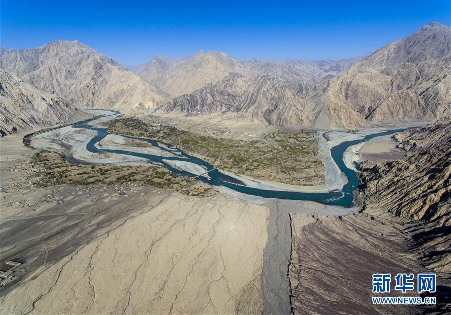 這是位于昆侖山深處的克孜勒蘇柯?tīng)柨俗巫灾沃莅⒖颂湛h庫(kù)斯拉甫鄉(xiāng),葉爾羌河從村莊流過(guò)(10月27日無(wú)人機(jī)拍攝)。 新華社記者 關(guān)俏俏 攝